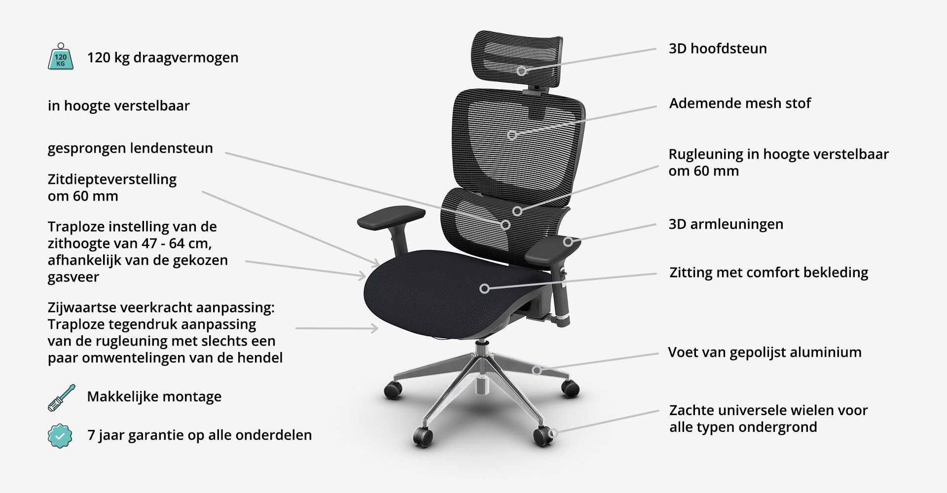 De rugleuning is voorzien van een synchroonmechanisme en is in hoogte verstelbaar tot 6 cm. De stoel past zich perfect aan u aan terwijl u zit. De rugleuning kan in drie standen worden vergrendeld en de tegendruk van de rugleuning kan traploos worden aangepast.