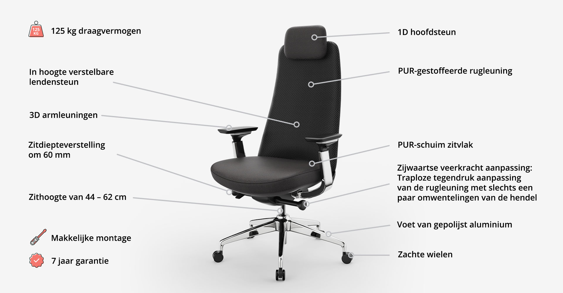 Ergonomische design bureaustoel met hoofdsteun en vele ergonomische instelmogelijkheden voor maximaal zitcomfort. Bekroond met de Red Dot Award.