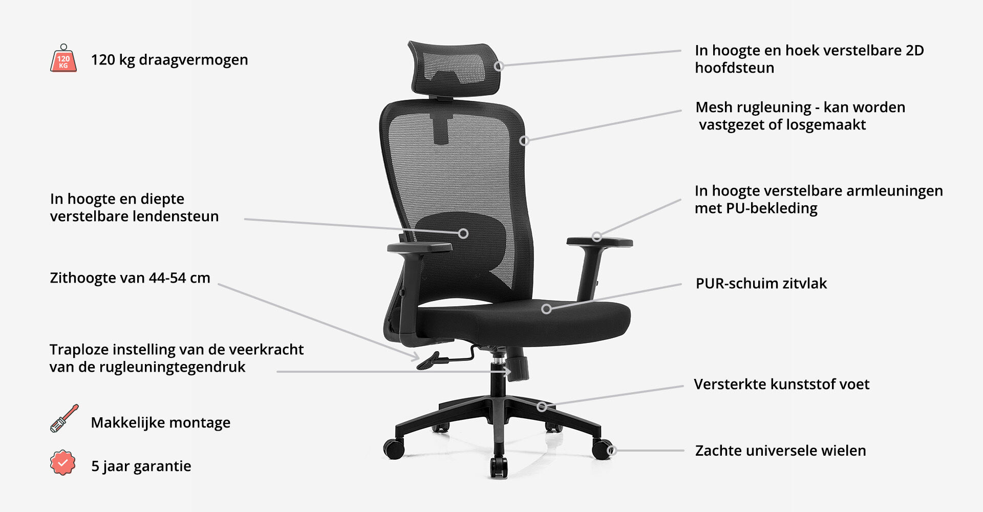 Ergonomisch zitten voor een instapprijs met verstelbare arm-, hoofd- en lendensteun. Comfortabel uitgerust met een gevoerde zitting en een mesh-rugleuning.