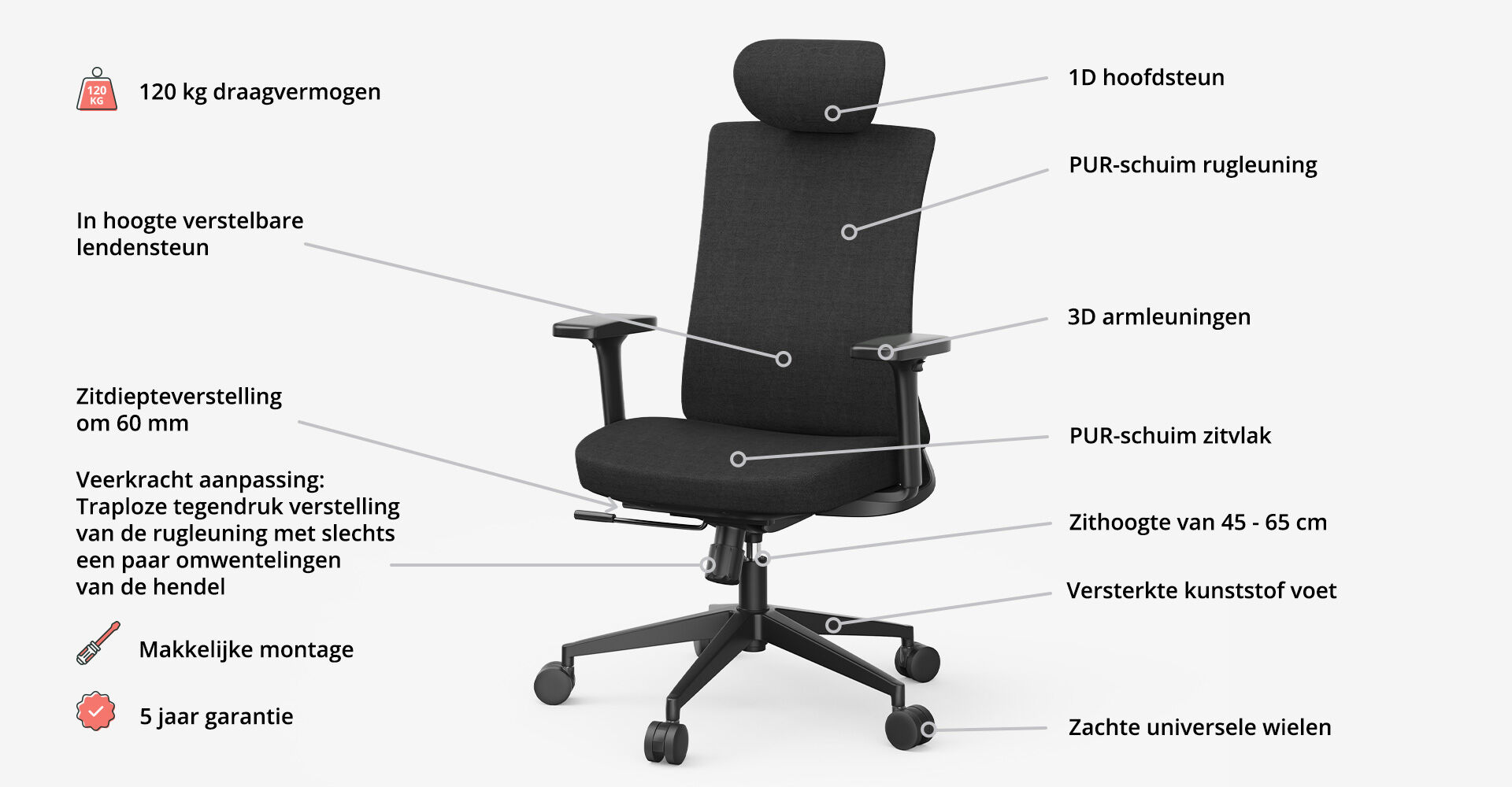 Rugvriendelijke bureaustoel met hoofdsteun en alle belangrijke functies voor een ideale kennismaking met ergonomisch zitten.