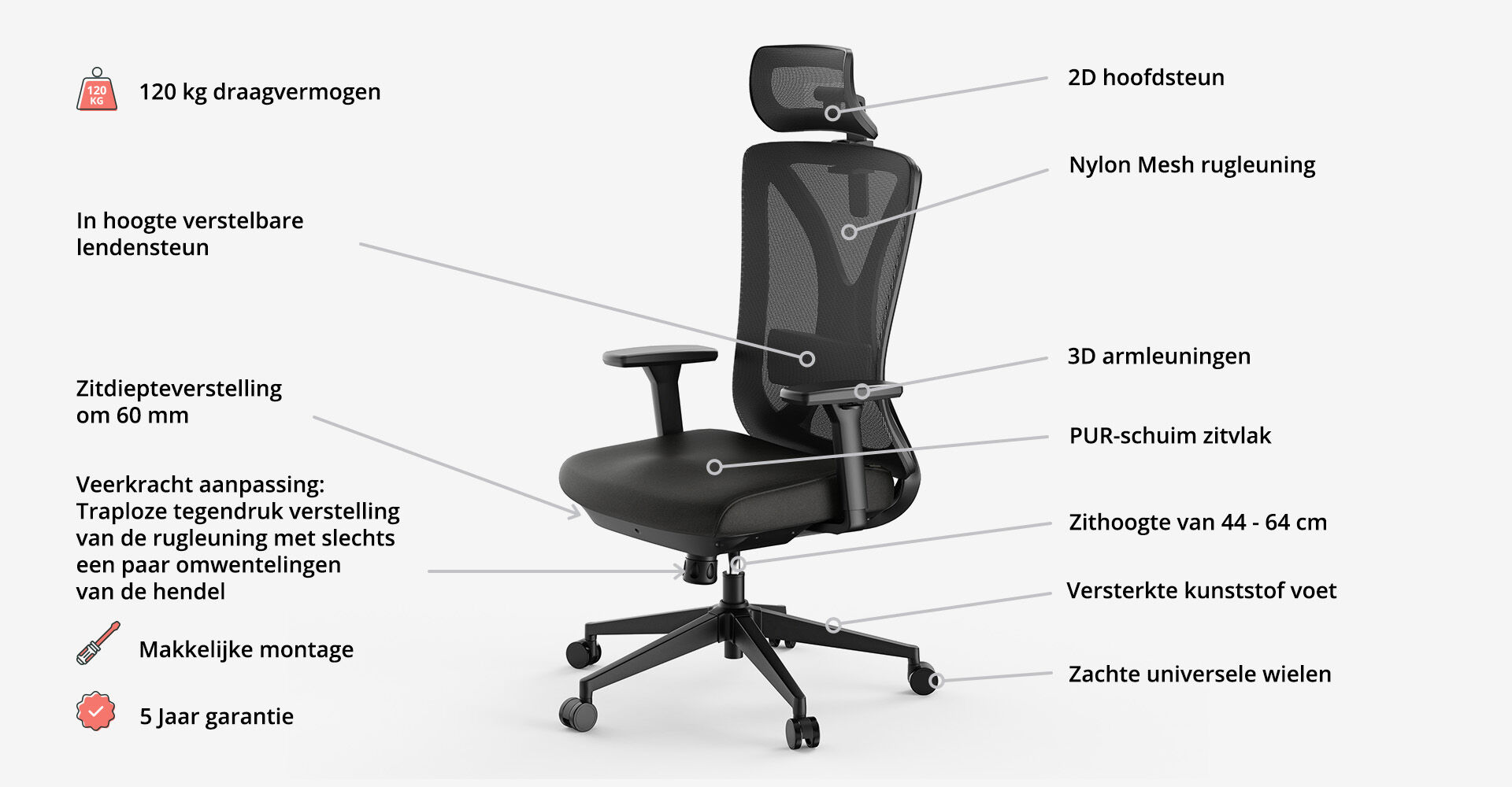 Individueel instelbare bureaustoel met mesh bekleding en verstelbare hoofdsteun. Perfect geschikt voor een kennismaking met ergonomisch zitten.