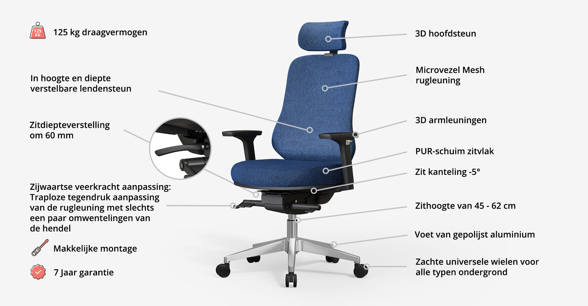 De belangrijke ergonomische functie van de in hoogte en diepte verstelbare lendensteun ondersteunt de lendenwervelkolom en de natuurlijke S-vorm van de wervelkolom optimaal. Dit gaat een gebogen rug actief tegen.