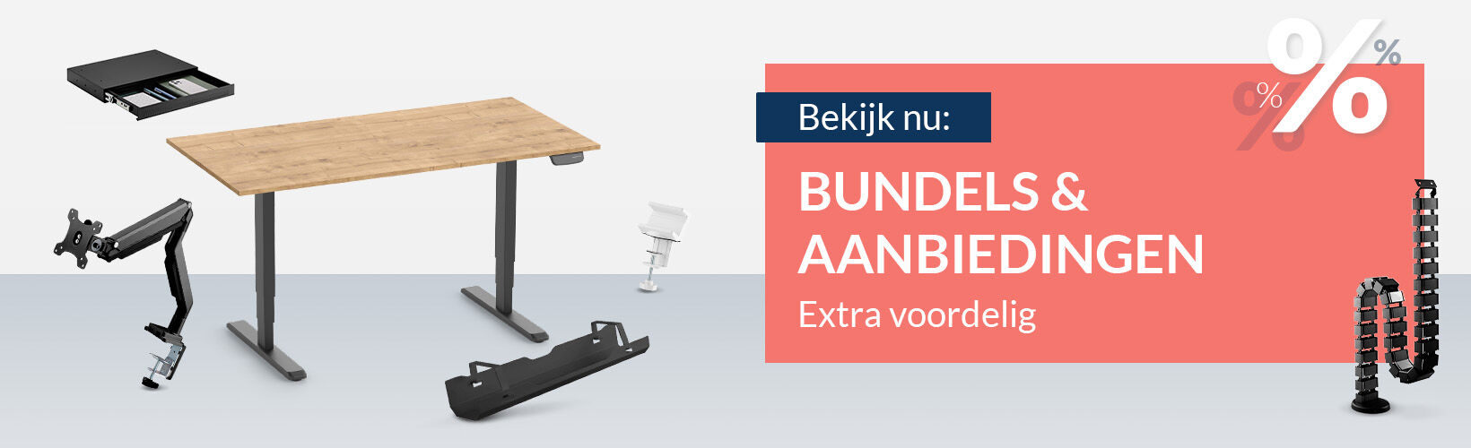 PRIMUS Bureau met lade, kabelslang en voetensteun. Ideaal om beweging en orde in het dagelijkse bureauleven te brengen.
