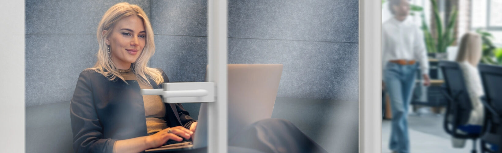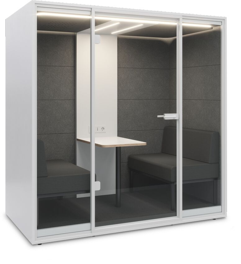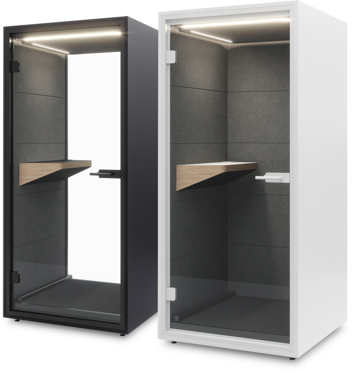Dankzij een groot aantal configuratiemogelijkheden kunnen de cabines perfect aan uw wensen worden aangepast. Kies de buitenkleur in wit of antraciet en ontwerp de binnenbekleding in akoestisch vilt in koffie, lichtgrijs of grijs. Het achterpaneel kan worden uitgevoerd worden als gesloten versie of van glas. In de Team-vergaderboxen kunnen de middenconsole in wit of antraciet en de stoelbekledingen in koffie, lichtgrijs of grijs afzonderlijk worden geselecteerd. Dit creëert een uitnodigende sfeer die harmonieus integreert in uw gebouw..